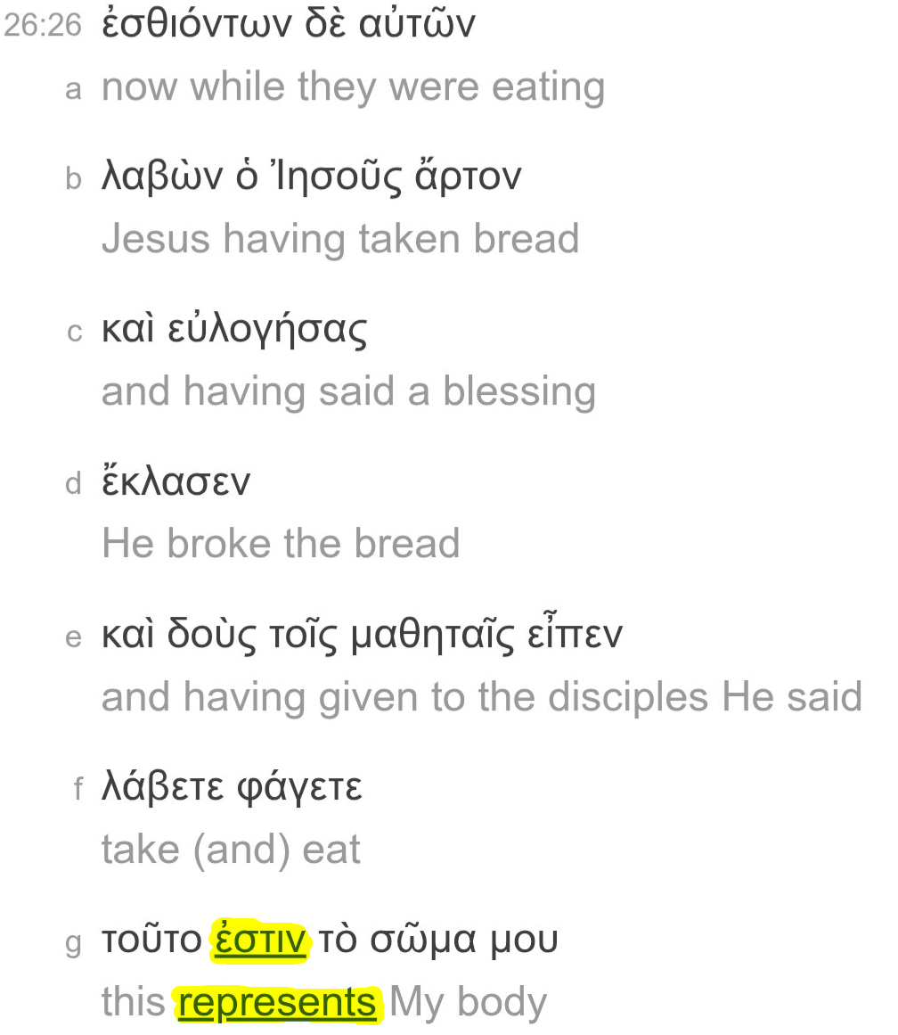 [2] The quote is technically incorrect. Strictly speaking, the verb ‘to be’ in the phrase “this is my body” acts grammatically as a copula—a linking verb—not a verb of existence.